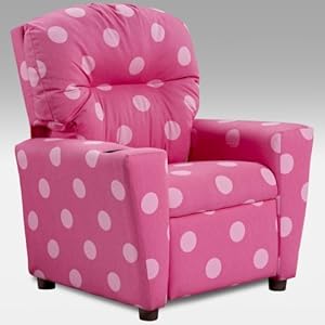 Oxygen Pink Kid's Recliner Upholstered in a 7 oz. bright pink fabric which features a large polka dot all-over pattern on it. The bright, fashion-forward colors make this an appealing addition to any young girl's room or family room to enjoy while watching movies, reading her books, playing with her friends or just curling up to relax on. Features a mixed hardwood frame filled with polyester fiber fill and densified fiber for comfort and s... Read More...